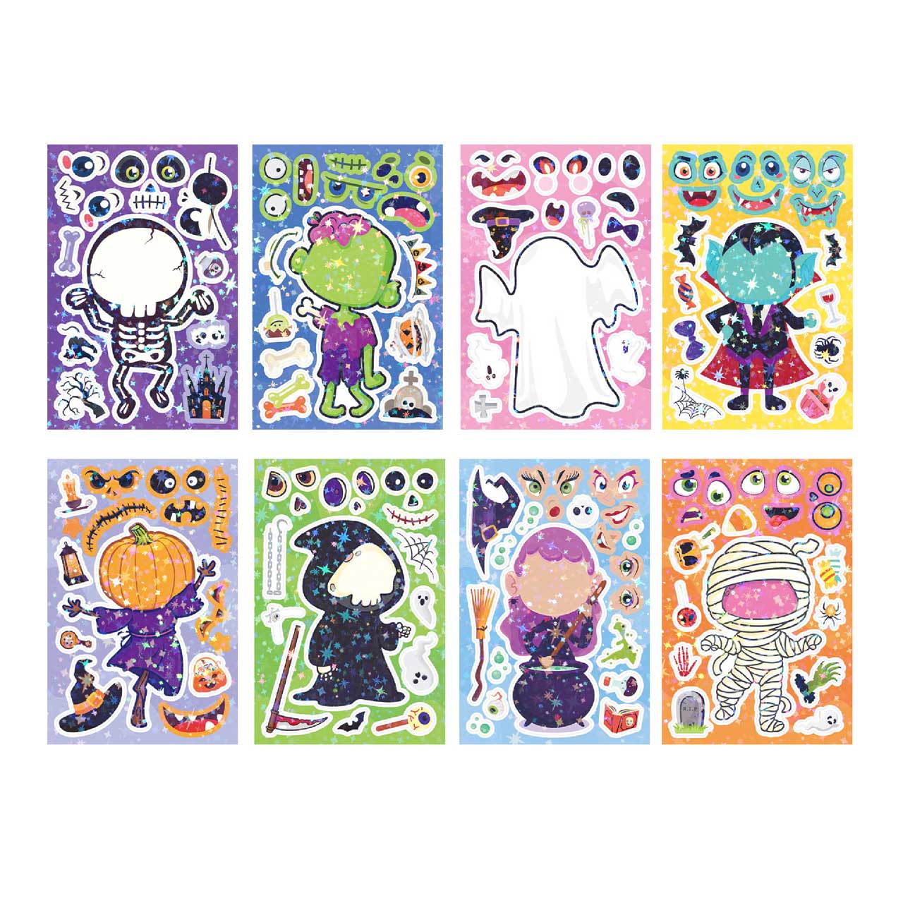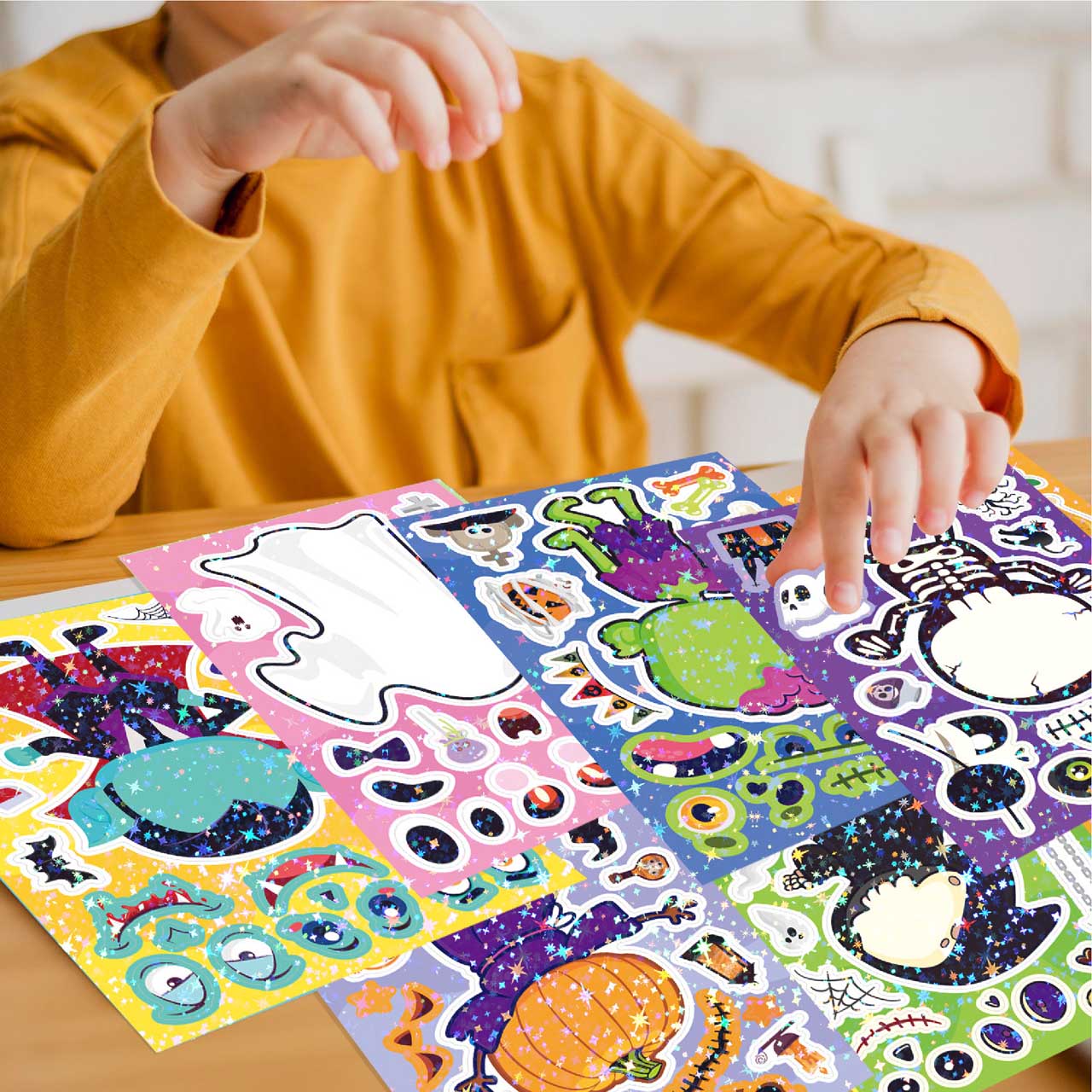 Create your own spooky characters with these glitter Halloween sticker sheets! Each sheet includes mix-and-match pieces like eyes, hats, clothes, and accessories, perfect for kids’ crafts, party fun, and festive decorations.