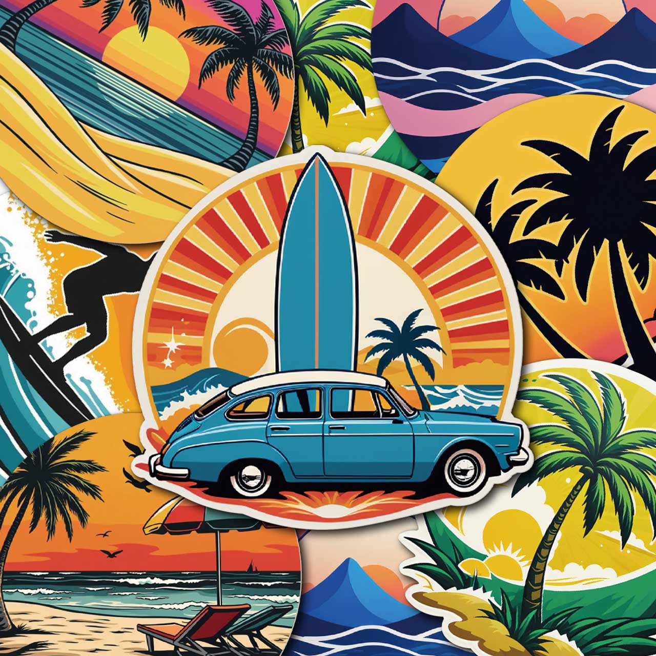 Surfboard stickers are vibrant decals tailored for adorning surfboards, often featuring ocean-themed designs, brand logos, or bold graphics that reflect surf culture. They’re durable enough to withstand water and sun exposure, adding personality to boards while withstanding the rigors of surfing.
